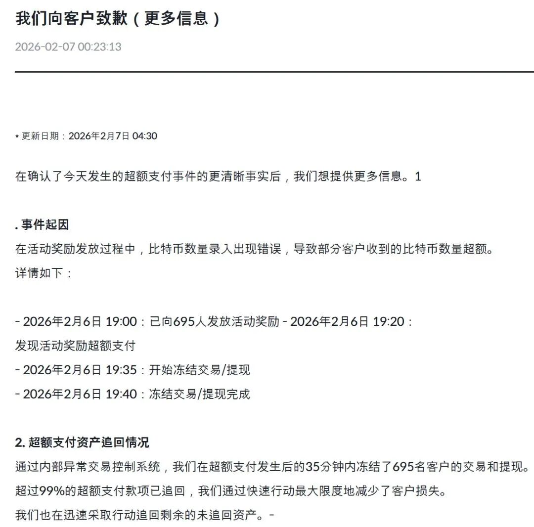 在发生错误发放后的35分钟内,该交易所已对受影响的695名客户采取了限制交易和提现的措施。
