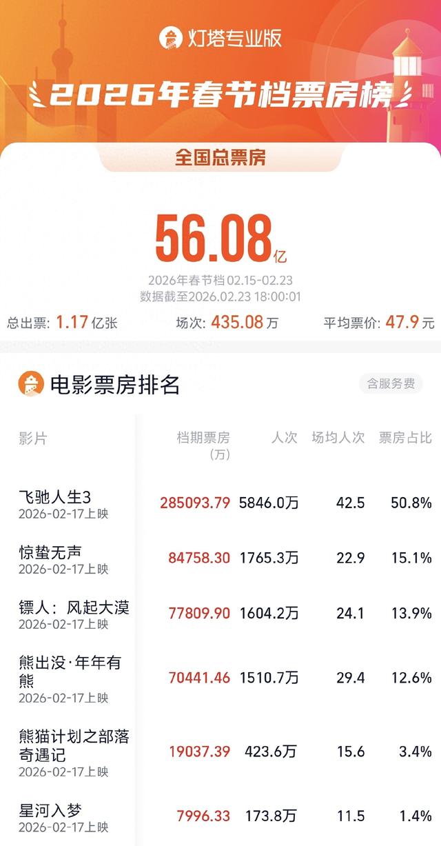 据大麦娱乐旗下灯塔专业版数据,截至2月23日18时,2026年春节档总票房突破56.08亿,总场次435.08万场,总人次1.17亿,平均票价47.9元,总场次大幅刷新中国影史春节档总场次最高纪录,平均票价较去年春节档的50.8元下调接近3元。
